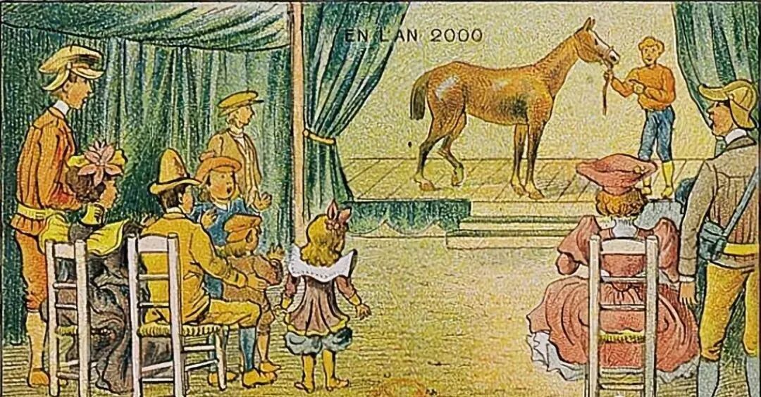 除了有美好的预测,还有一些悲观的预测,比如下面这张图片,几名小孩正在参观一匹活马,随着技术的发展,这张图片的作者认为未来的许多孩子们将很难看到活着的马匹。