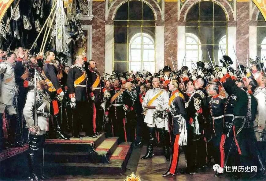 从当时德意志地区的所有邦国来看,最具正统和实力还是哈布斯堡家族控制的奥地利,毕竟该家族是神圣罗马帝国最直接的继承和代表。然而由于奥地利哈布斯堡家族的统治者太过迟钝,没能彻底掌控所辖区域。东普鲁士崛起后,在铁血宰相俾斯麦的领导下,经过三次王朝战争,普鲁士不断吞并其他德意志地区邦国,还从丹麦、法国等周边邻国那里夺回了很多原来的德意志失地。1871年,普鲁士人彻底打败法国,一统德意志,威廉一世也在众多王公贵族的簇拥下于凡尔赛宫镜厅加冕称帝。