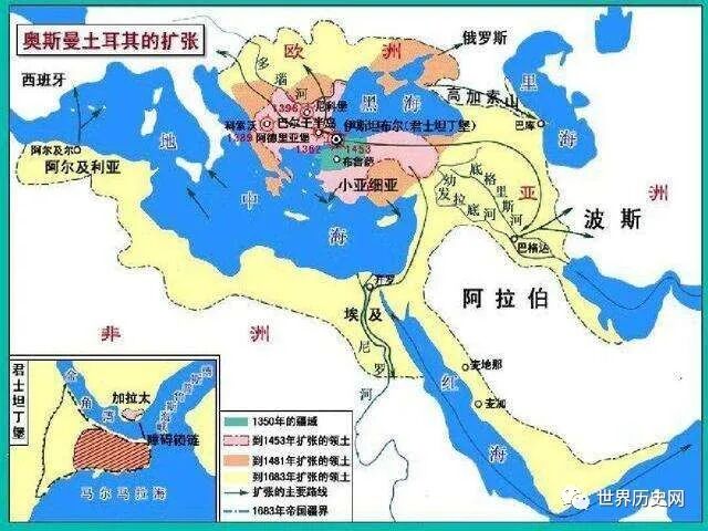 奥斯曼帝国崛起之后,首先对拜占庭帝国发起冲击,到了奥斯曼儿子奥尔汗时期,奥斯曼取得了伊斯坦布尔西南地区,这个地方是地中海通往黑海的咽喉要道,地理位置非常重要。
