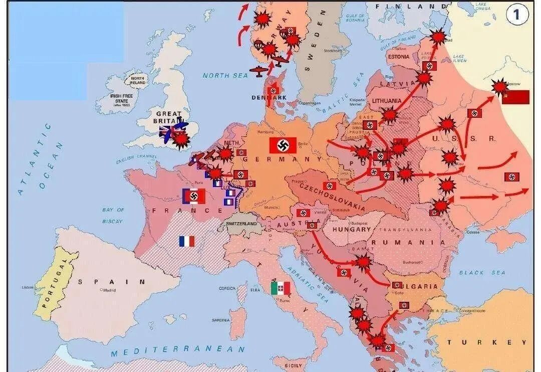 英法随即对德宣战,第二次世界大战全面爆发。1940年德军装甲席卷整个欧洲大陆,法国战败投降。6月10日,意大利向英法宣战,战火烧到了地中海和非洲。1940年7月16日,希特勒开始实施入侵英国的“海狮计划”,德国开始对英国城市进行了密集轰炸。1941年6月22日,德国撕毁了《苏德互不侵犯条约》入侵苏联,二战的规模扩大。1941年12月7日,日本偷袭珍珠港,太平洋战争爆发。