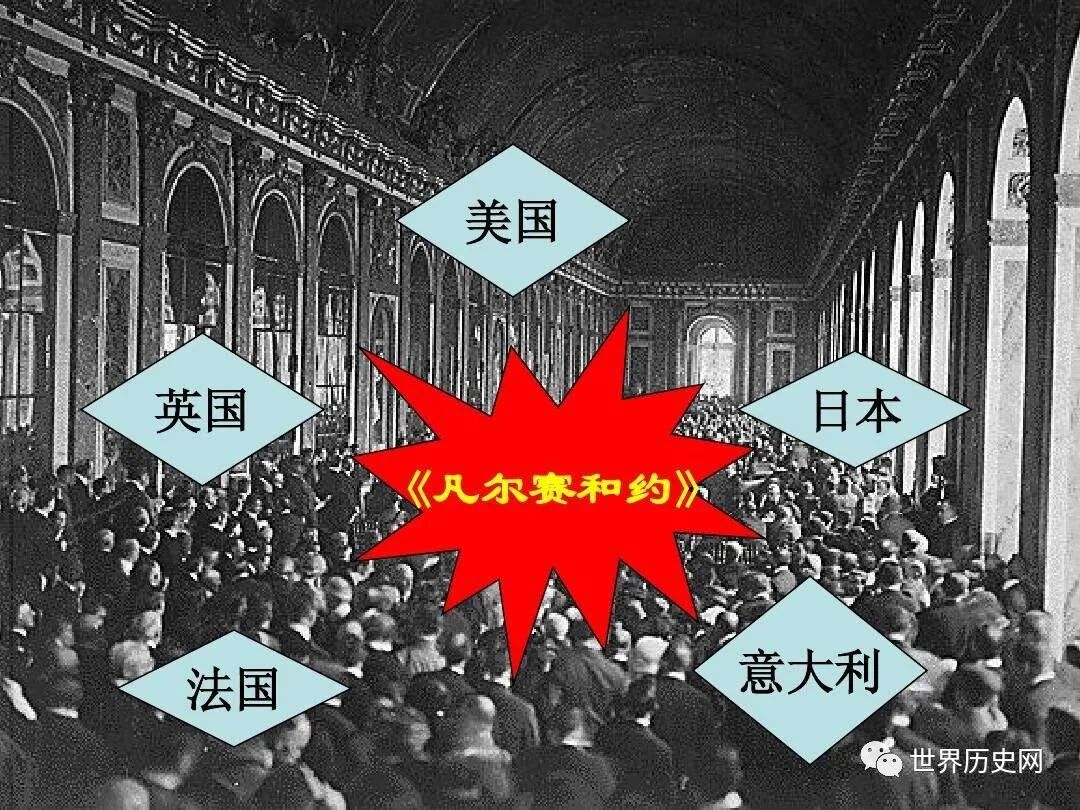 第一次世界大战是帝国主义危机和矛盾的产物,但战争较量的结果并未解决根本问题。1919年1月18日,一战战胜国在巴黎召开和平会议,讨论与战败国签订和平条约,建立国际联盟。参会各国围绕重新瓜分世界的问题激烈争吵,最终于6月28日在巴黎近郊凡尔赛宫签订《凡尔赛和约》。通过该和约,英、法攫取了最大利益,确立了凡尔赛体系,但引起了德国人普遍的不满。在和会上遭到英、法联合抵制的美国最终也未得偿所愿。