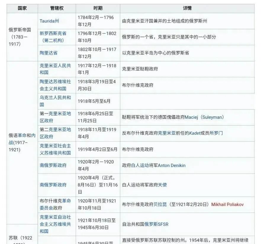 在俄罗斯国内,半岛在多个内部行政机构之间转移。在俄罗斯帝国和苏联时期,直到1954年移交给乌克兰苏维埃社会主义共和国,克里米亚由14个政府管理。从兼并到1954年移交,克里米亚由下列管辖区管理: