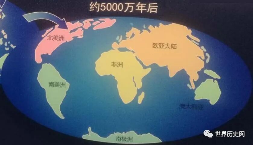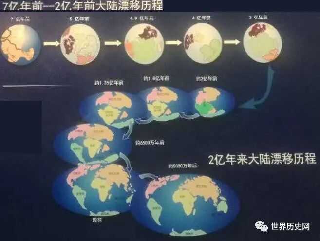 一张7亿年来及未来5000万年的大陆漂移图很是醒目,让人不得不感慨岁月变迁沧海桑田。