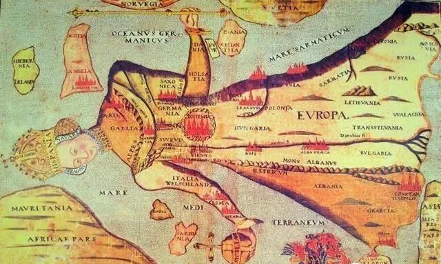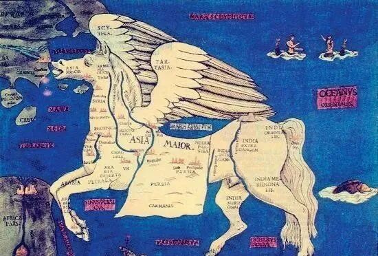 1581年绘制的“飞马亚洲”地图。马首是小亚细亚,后颔是亚美尼亚,颈部是西亚,右翼是斯基泰,左翼是鞑靼,从后腰到右后腿是印度,左后腿是马来半岛,马尾是Quinsay指称的是杭州,而此图作者在这里则是用Quinsay来代表中国。