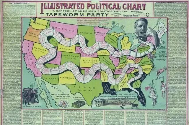 1888年美国绦虫地图,每个节片上都是党派政治丑闻。