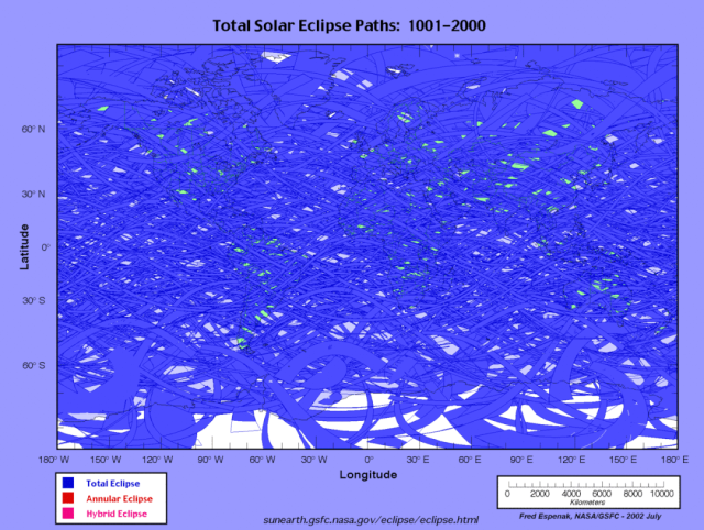 图解:1001年至2000年的日全食路径,显示地球各处都可以(有机会)看见日全食。这张图是由50张NASA的日食路径图合并而成的。-照片由NASA提供