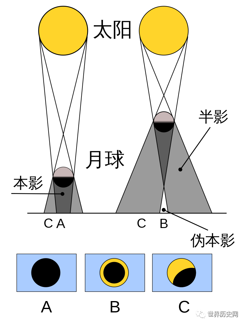 图解:A 本影区出现日全食。 B 伪本影区出现日环食。 C 半影区出现日偏食