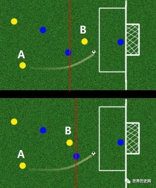 ”越位“小知识:下图中图上球员A传球瞬间,球员B处于越位位置;图下球员A传球瞬间,球员B不处于越位位置。