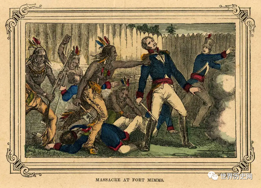 Creeks 的 Red Stick 师与美国作战,最著名的交战是 1813 年 8 月 30 日的 Fort Mims 大屠杀(在现代阿拉巴马州)。Red Sticks 的惊人胜利加剧了美国人对英国人的愤怒,英国人他们推测是在武装红棒。