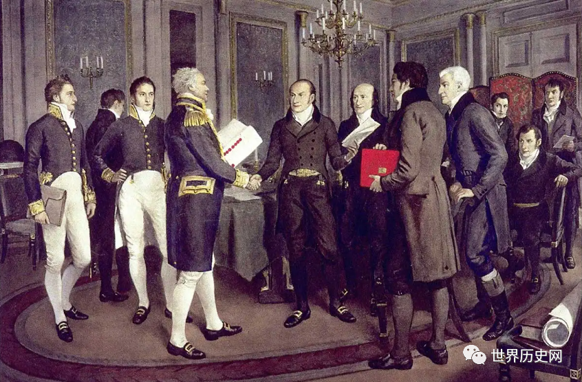 1814年春天,法国败给了英国、奥地利、普鲁士和俄国。作为枫丹白露条约的一部分,拿破仑放弃了王位,并被流放到地中海的厄尔巴岛。