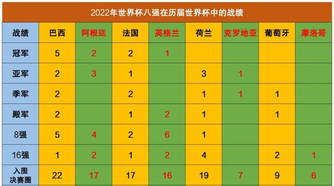 1930年首次参加世界杯,22次参加世界杯,22次入围决赛圈