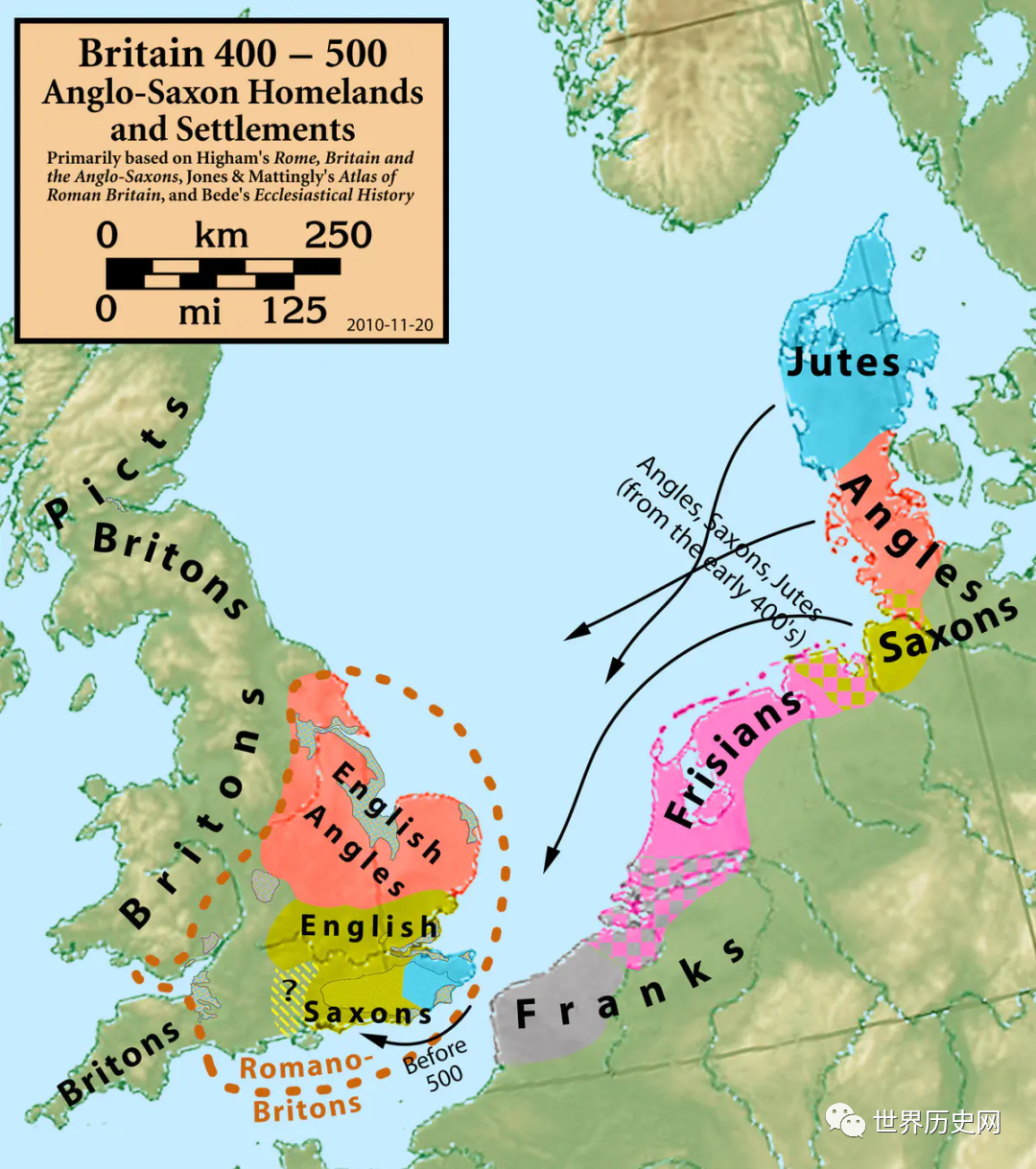 朱特人(Jutes)、盎格鲁人(Angles)、撒克逊人(Saxons)入侵不列颠示意图