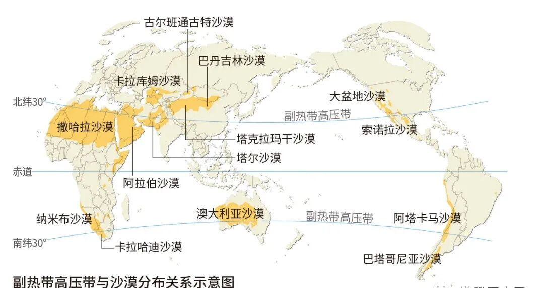 受副热带高气压带等因素影响,全球纬度23度到35度之间,无论北半球还是南半球,包括卡塔尔所处的西亚在内,大都被荒漠覆盖。