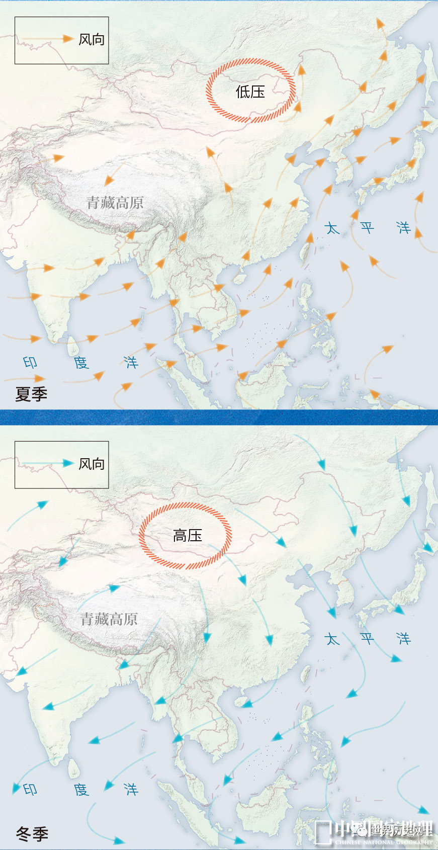 与此同时,欧亚大陆和太平洋之间由海陆热力差异所造成的季风现象,因青藏高原的存在而大大加强了。季风从太平洋和印度洋吹来,给中国东南地区带来了丰富的水汽,荒漠变成了水乡。
