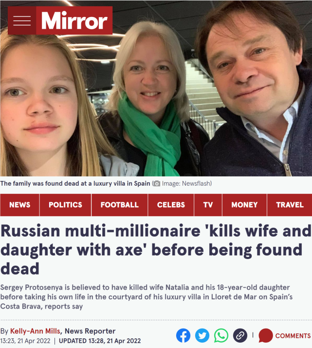 4月19日:谢尔盖·普罗托森亚和妻子及女儿的尸体在位于加泰罗尼亚Lloret de Mar海滨度假区的家中被发现。报道称,这对夫妇育有两个孩子,长子住在法国,当时他无法联系到父母,于是向加泰罗尼亚警方报了警。据报道,普罗托森亚现年55岁,妻子53岁,他们的女儿刚满18岁。普罗托森亚的妻女是被刺死的,而他则是上吊自杀的。