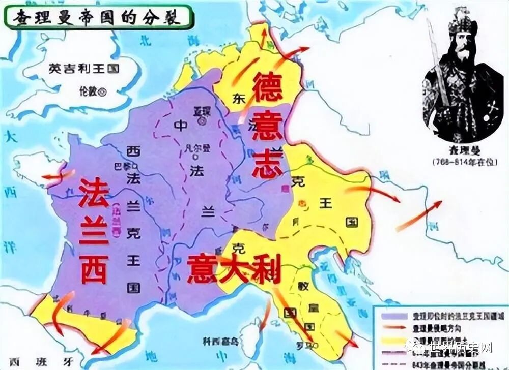 查理大帝一生有4个儿子,不过查理大帝长寿,三个儿子比他还先去世,因此路易一世成为了唯一的继承人,而在823年前,路易一世有3个儿子,他将国家平分给了3个儿子。