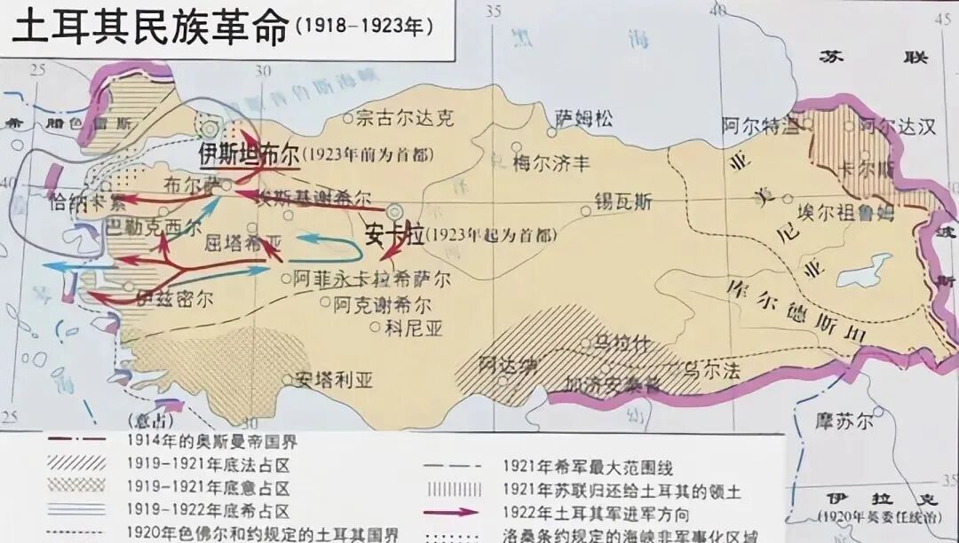 之后,凯末尔领导起义军反抗协约国的占领和瓜分,在1922年8月,从希腊手中夺回了小亚细亚西部和色雷斯东部,迫使协约国宣布废除《色佛尔条约》。