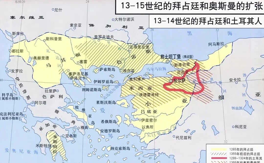 在拜占庭篇中向大家介绍过,此时的拜占庭迫于财政压力和内斗需要,已经放弃了自身的军事建设,国防完全就靠雇佣兵来维持,而亚洲地区的正规军基本上也被全部撤走,这就为奥斯曼的崛起提供了极好的生存环境。