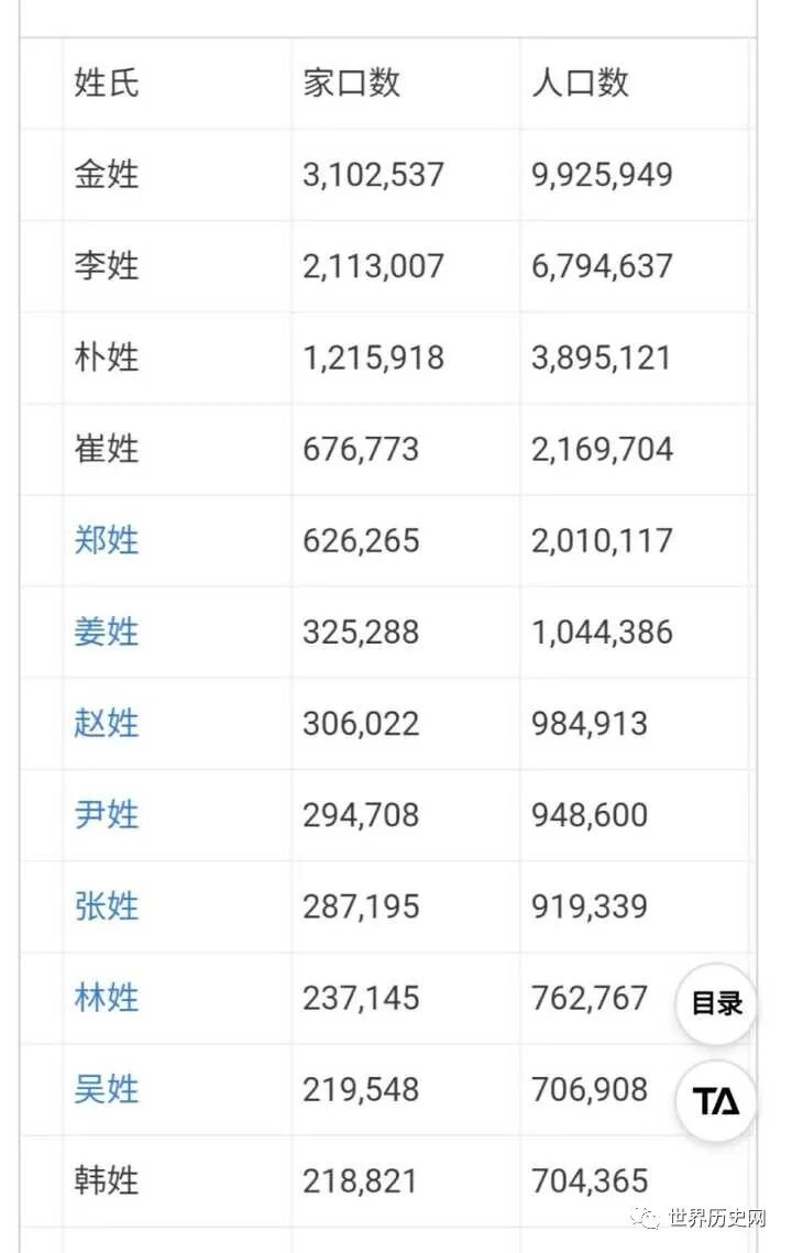 朝鲜半岛的7500万人以及散居全球的700万韩裔人中,金、李和朴三个姓氏大约占了一半。姓金的有约1000万人,占总人口的五分之一。综合统计数据显示,目前韩国正在使用的姓氏不足250个。而日本和荷兰的姓氏数量都超过10万。