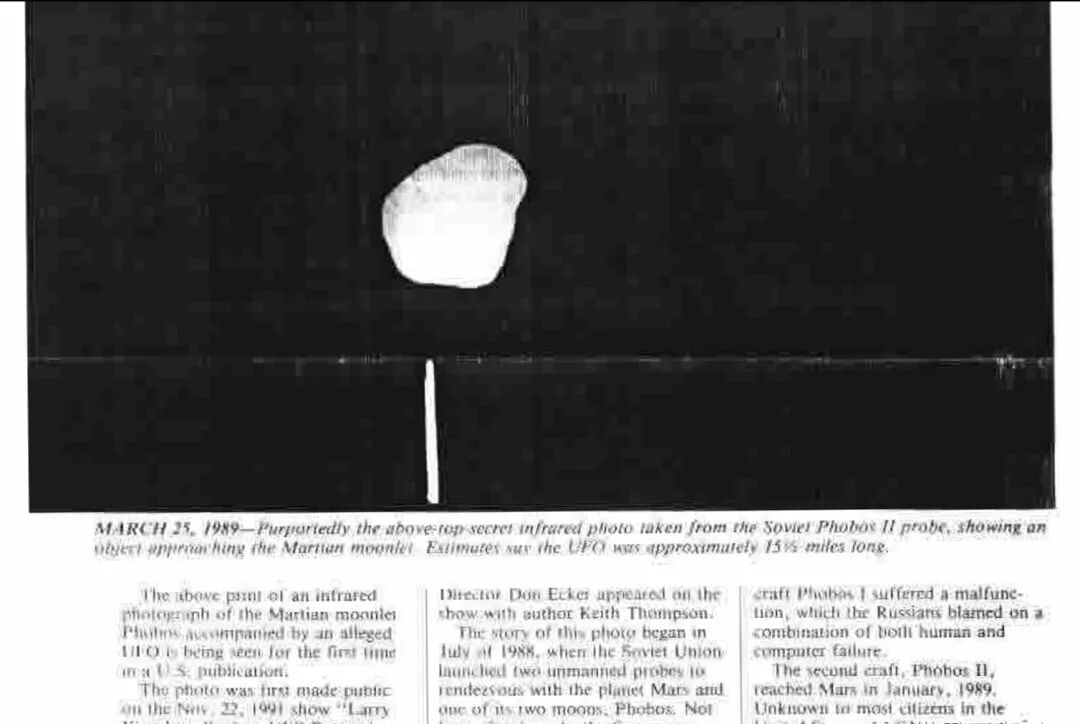 1991年,就在苏联解体的前几个月,一名叫做玛丽娜.波波维奇的苏联空军少校和预备役宇航员到了英国,召开了一个新闻发布会,她拿了一张著名的照片,在照片上,可以清晰地看到火卫一下方有一个雪茄状的不明物体。