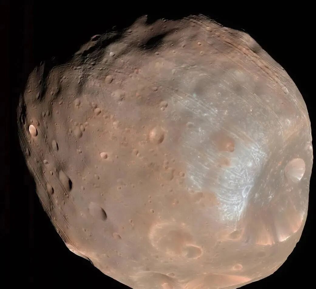 因为火卫一近距离观看,就是一个丑陋的大石头,它的表面有很多陨石坑,但由于长时间绕火星旋转,表面变得很光滑,还有一个直径10公里的巨型陨石坑,应该是一颗小行星,把火卫一撞得凹了进去,在阳光下很明显。