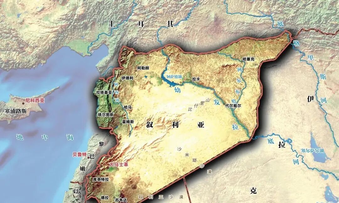 叙利亚位于亚洲西部,地中海东岸,国土总面积185180平方公里,北与土耳其接壤,东同伊拉克交界,南与约旦毗连,西南与黎巴嫩、以色列为邻,西与塞浦路斯隔地中海相望,首都大马士革。
