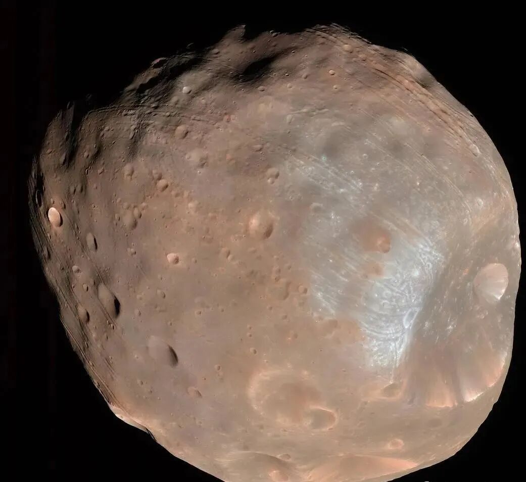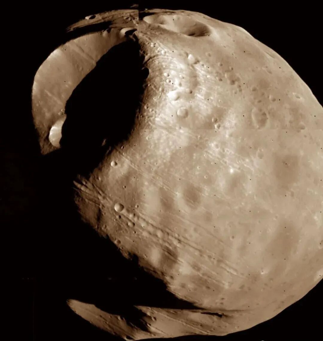 因为火卫一近距离观看,就是一个丑陋的大石头,它的表面有很多陨石坑,但由于长时间绕火星旋转,表面变得很光滑,还有一个直径10公里的巨型陨石坑,应该是一颗小行星,把火卫一撞得凹了进去,在阳光下很明显。