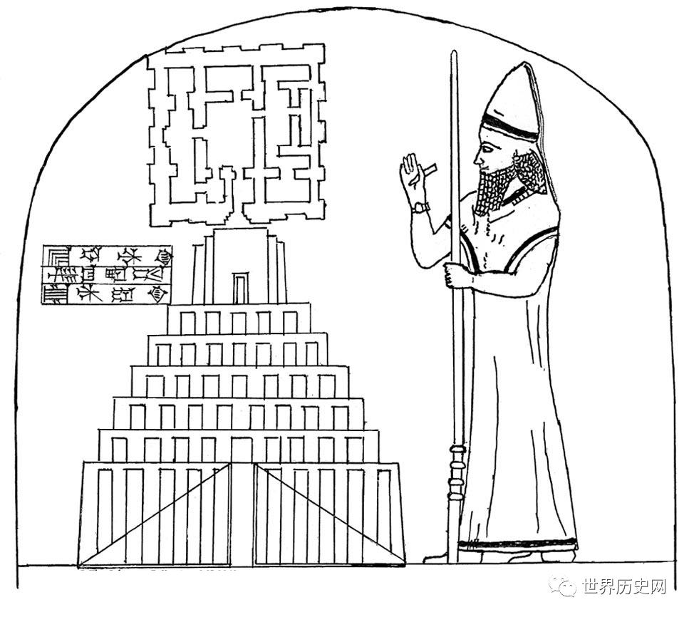 对“通天塔”中的雕刻进行了重建。它显示了尼布甲尼撒二世的站立人物,他戴着皇家锥形帽,左手拿着一根杖,右手伸出一个带有重建塔(或地基钉)计划的卷轴;顶部:顶部寺庙平面图的线条图,显示了外墙和房间的内部布置,包括曾经有一张精美大沙发的房间(Schoyen Collection,2021)。