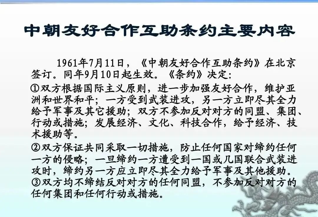 所以在抗美援朝战争胜利后,美国撤军了,志愿军回国了,但中朝双方仍然在1961年正式签署了《中朝友好合作互助条约》。