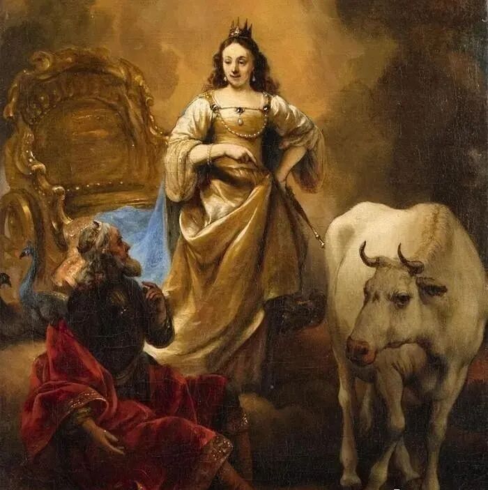 宙斯的妻子赫拉可不是个好惹的女人,她知道自己老公的德性,便利用自己的神力密切监视宙斯。有一天,赫拉用天眼扫描地面,发现在阳光普照的彼拉斯齐人的领地上,有个地方云遮雾绕,赫拉立即飞往那里。宙斯的神识感知到妻子来了,连忙将怀里可爱的伊娥变成一头雪白的小母牛。赫拉来到,没看到奸情,只看到一头小母牛,满肚子的火发不出,便要求宙斯把这头小母牛送给自己,宙斯答应了。于是赫拉在小母牛脖子上系根带子,牵走了。