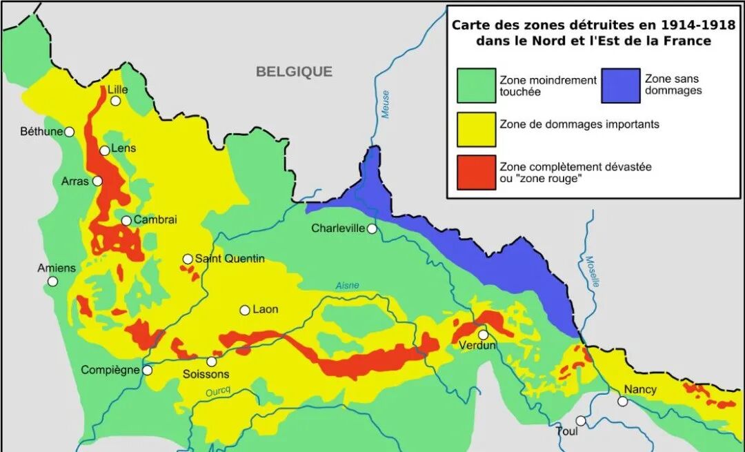 然而,土壤污染最严重的地方是在法国。第一次世界大战后,法国政府将从法国北部里尔到南锡西南部的区域指定为“红色区域”,由于土壤污染和未爆炸的弹药,该区域被宣布为不适于居住的区域。