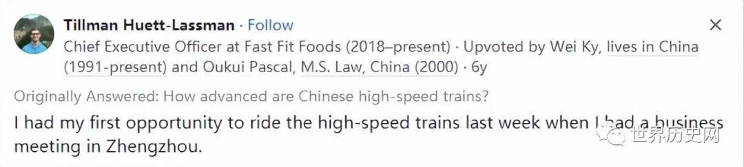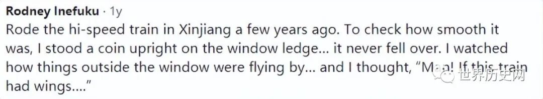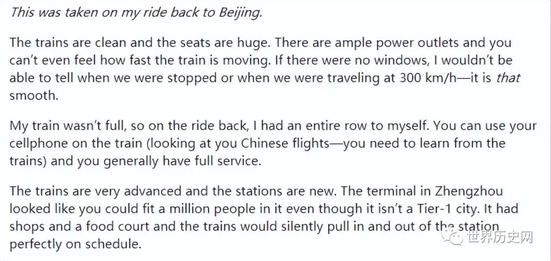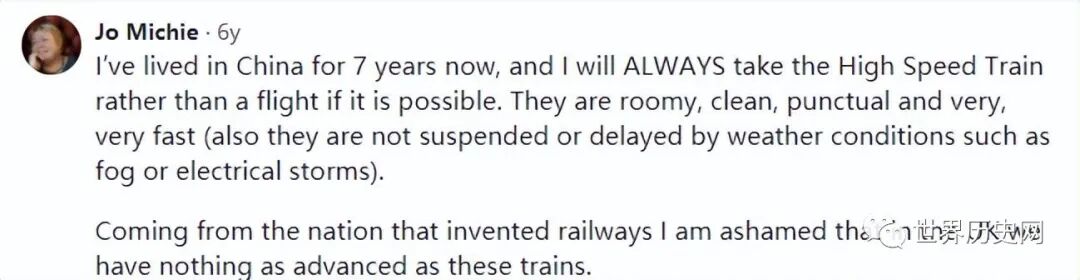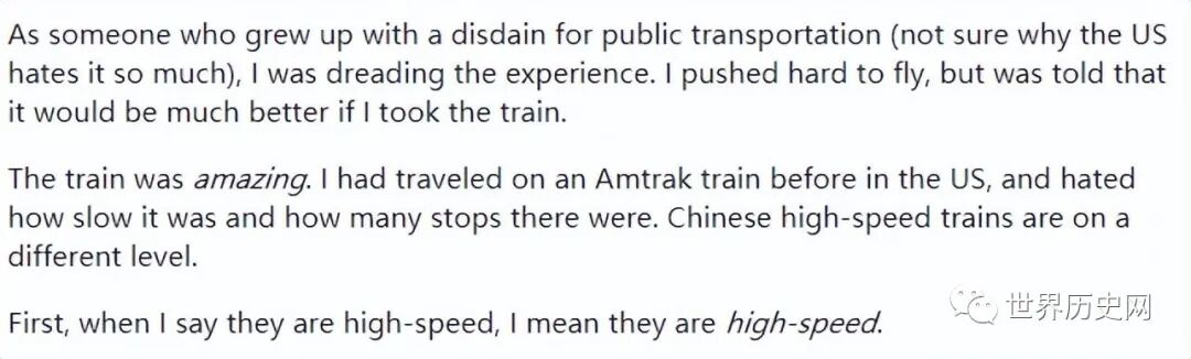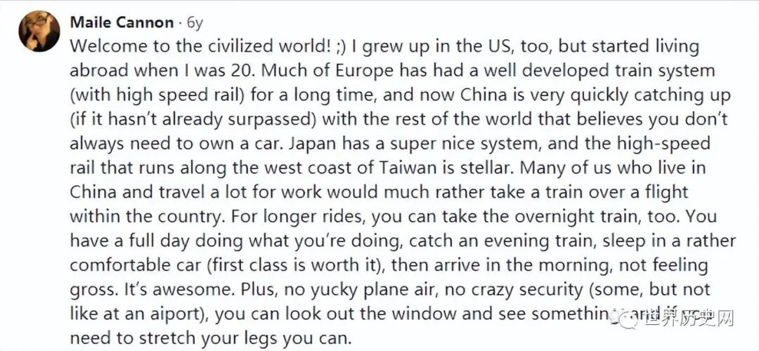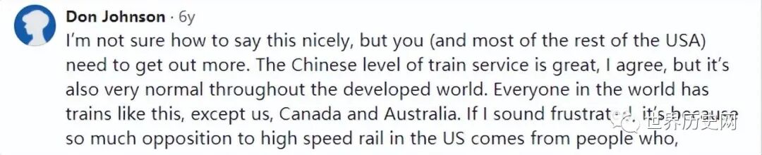 我不知道该怎么说,但真的(美国等其他人)需要多走出去。中国的火车服务相当不错,这在发达国家也是具备的。除了我们、加拿大和澳大利亚,很多地方火车都是这样的。其实我很沮丧的,因为在美国,反对高铁的人太多了,甚至不知道是什么,同样和你一样,世界上很多地方的人都认为是理所当然的。