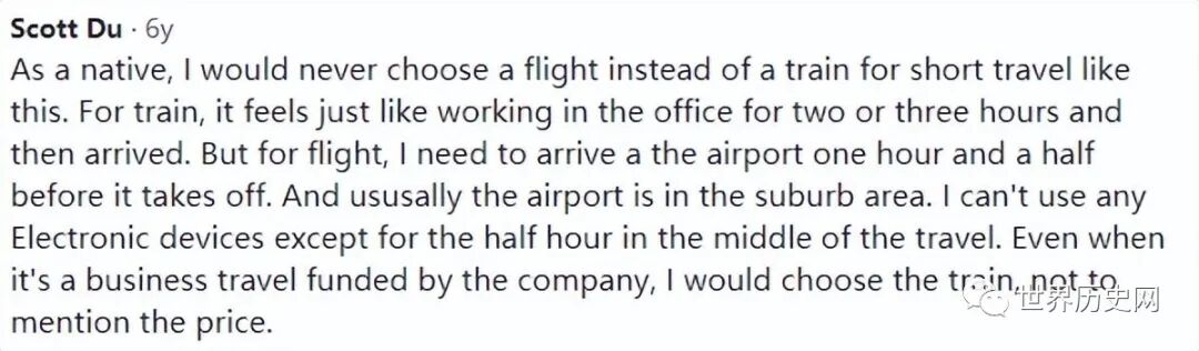 我是一个土生土长的中国人,作为短途旅行,我永远不会选择飞机而是选择火车,因为感觉做火车就像在办公室做了2.3个小时,接着就到了,但是飞机,得需要一个小时提前到机场,而且机场还在郊区。而且在途中的时间里,我还不能使用电子设备,即便是公司报销出差费用,我还是选择火车,倒不是价格的事。