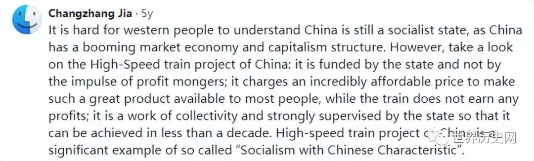 西方国家难以理解作为社会主义的国家,中国有非常好的蓬勃发展的市场经济和投资结构。看一下高铁项目:国家投资,而不是由投资商人投资;还有令人难以置信的实惠票价为很多人提供优质的服务,总的来说高铁基本没有什么利润;这是一项惠民的项目,由国家严格监督,所以在不到10年的时间实现了。中国的高铁工程是“中国特色社会主义”的典范。