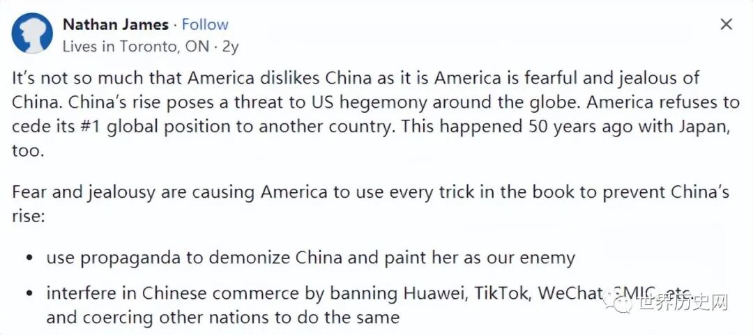 与其说美国不喜欢中国,不如说美国害怕和嫉妒中国。中国的崛起对美国在全球的霸权构成了威胁。美国拒绝将其全球第一的地位让给另一个国家。这也发生在50年前的日本。