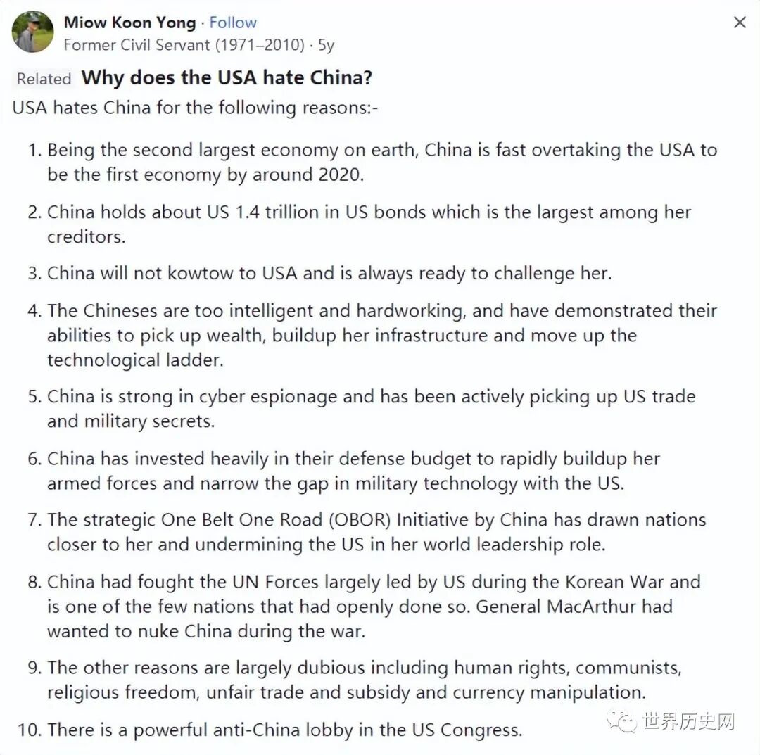 对于普通美国人来说,他们憎恨中国有很多不同的原因,尽管他们并不真正了解中国的真实情况。但大多数仇恨确实是基于某种优越性。