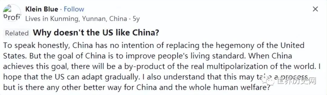 老实说,中国无意取代美国的霸权地位。但中国的目标是提高人民的生活水平。当中国实现这一目标时,就会出现世界真正多极化的副产品。我希望美国能够逐渐适应。我也理解这可能需要一个过程,但对于中国和整个人类的福利来说,还有其他更好的方法吗?