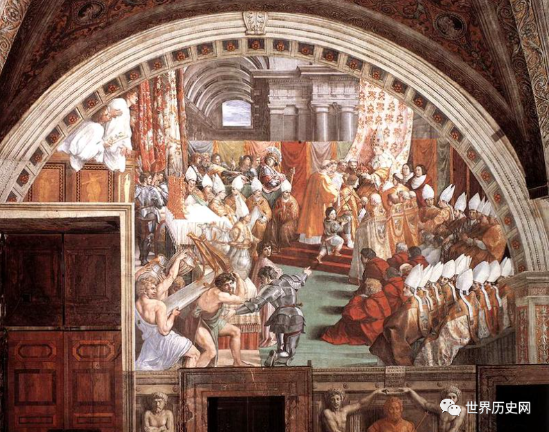 为报答查理,这年的圣延节,在圣彼得大教堂里,利奥三世为他举行了皇帝的加冕礼,把一顶金光闪闪的皇冠戴在他头上,并且宣称:“上帝为查理皇帝加冕,微祝这位伟大的和带来和平的罗马人皇帝万寿无疆和永远胜利。”在这虚妄的费美声中,法兰克王国成了查理帝国,查理则成了“大帝”,具有至高无上的权威。从此,在欧洲,教权与王权结成了联盟。教皇利奥三世在拉特兰教堂挂上一幅彩色镶嵌画,描绘彼得(耶稣的门徒之一)正在把披风送给教皇,把旗帜送给国王,祷文上写着:“圣彼得把生命赐给教皇利奥,把胜利赠与国王查理!”这就是“格拉西亚信条”,崇奉教权与王权共同统治世界。