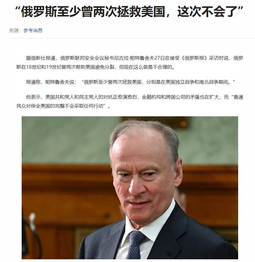 前段时间俄联邦安全委员会秘书帕特鲁舍夫就说,俄罗斯在历史上曾经帮过美国两次,都是美国濒临灭亡万分危急的时刻,现在美国不但不感恩,反而公然和俄罗斯对着干,这种忘恩负义的行为太让俄罗斯伤心了。以后美国要是再到亡国灭种的时刻,俄罗斯绝对不救。