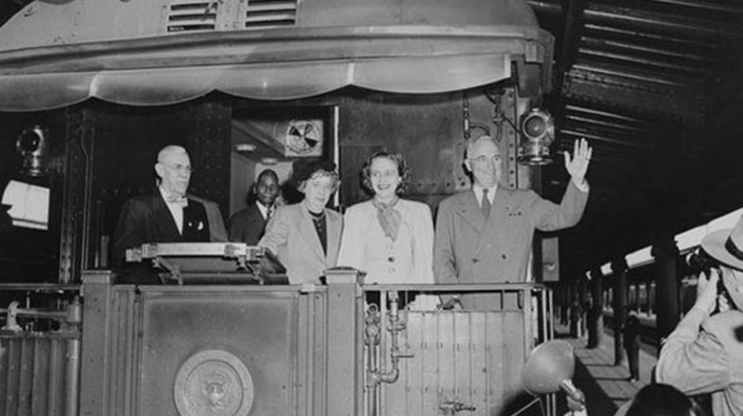 于是杜鲁门选择改变玩法,他要进行一场“火车”竞选。1948年9月至11月,杜鲁门开始了一场史无前例的“大选远征”他乘坐火车,从东海岸到西海岸,再从西海岸回到东海岸,途中他在每个城市停留,不论大小。火车到站后,就以火车站为场地,就地向民众发表演说。