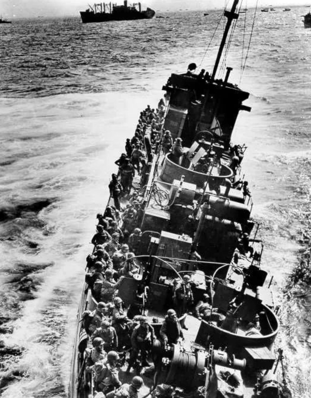 ◇ 图为一艘满载士兵的美国海岸警卫队巡逻艇在向诺曼底奥马哈海滩挺进中