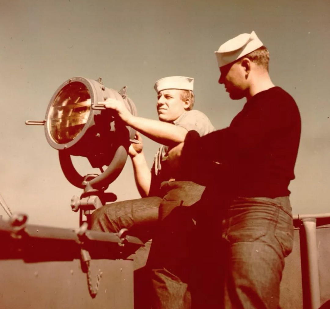 ◇ 图为二战期间,正在为附近舰只提供信号的美国海岸警卫队的队员