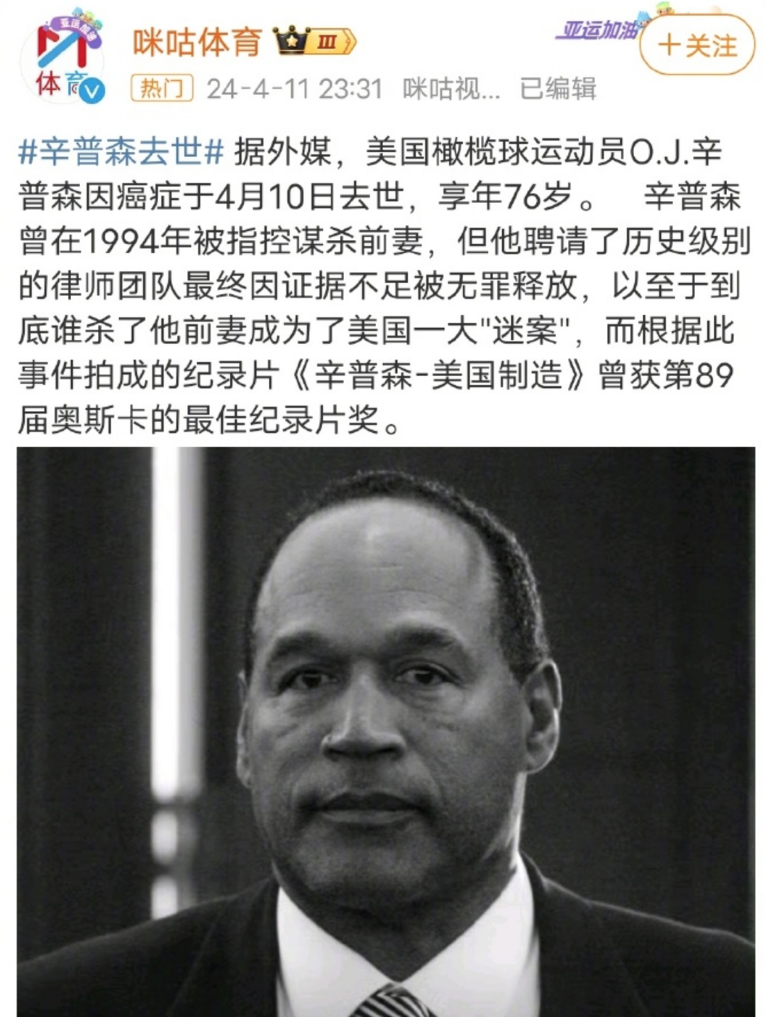 前几天,美国前橄榄球运动员辛普森去世,在美国叫辛普森的太多了,而这位叫奥伦塞尔·詹姆斯·辛普森。