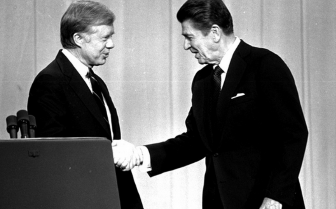 ◇ 图为电视辩论前,候选人里根与卡特握手