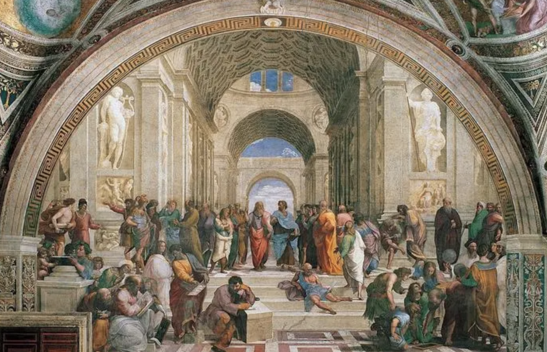 ◇ 图为拉斐尔的代表作《雅典学院》,画中的古希腊先哲们在思考,辩论