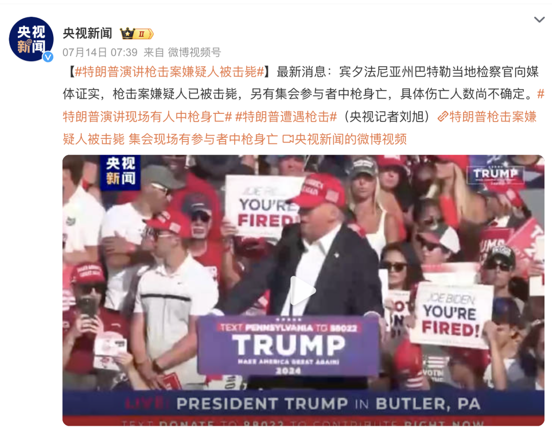 前两天,美国人又搞了一个大新闻。前总统特朗普在宾夕法尼亚州巴特勒市给自己进行拉票演讲的时候遇刺,杀手非常看不上特朗普,于是准备动用极端方法把他进行物理清除。可能是特朗普讲话喜欢摇头晃脑,所以好巧不巧的被他躲过去,只擦伤了耳朵。