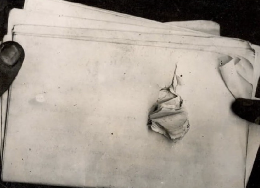 ◇ 图为老罗斯福被子弹击穿的演讲稿和眼镜盒