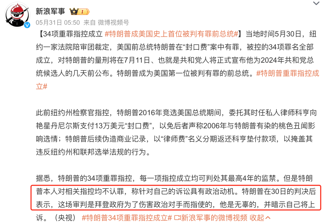 另一边,今年五月,共和党总统候选人特朗普被纽约一法院陪审团裁定在“封口费”案中有罪,被控的34项罪名全部成立,每一项罪名的最低刑期为1.3年,最高刑期为4年。如果所有罪名都以最高刑期计算,特朗普可能面临最高136年的刑期。