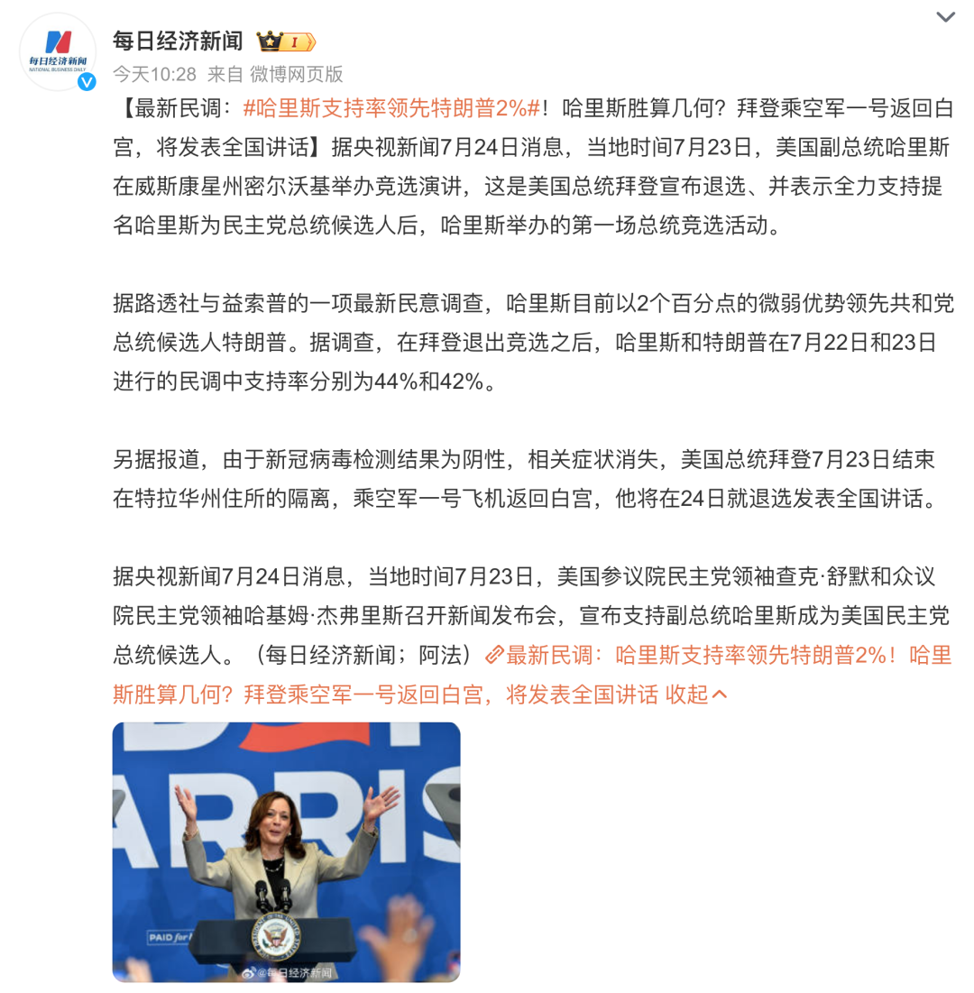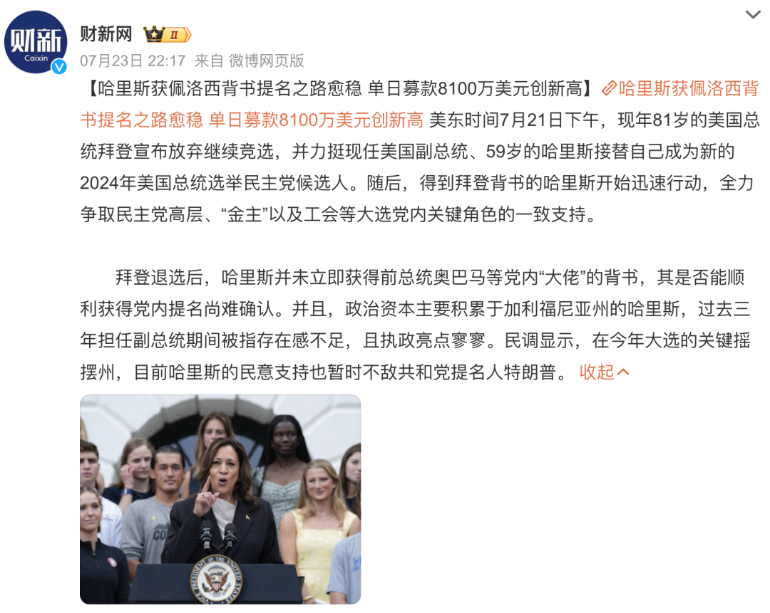美国进入2024大选年,前一阵老拜登官宣不寻求连任,作为老爷子副手的副总统哈里斯接过民主党总统候选人的名额,不仅最新民调显示,哈里斯的支持率领先特朗普2%,还在一夜之间募集了8000多万美元的竞选资金。