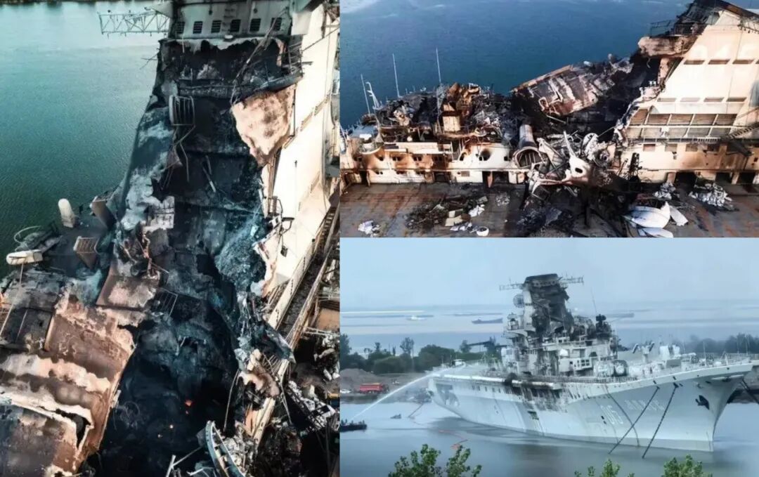 ◇ 图为意外失火的明斯克号航母,舰岛已经完全没烧毁
